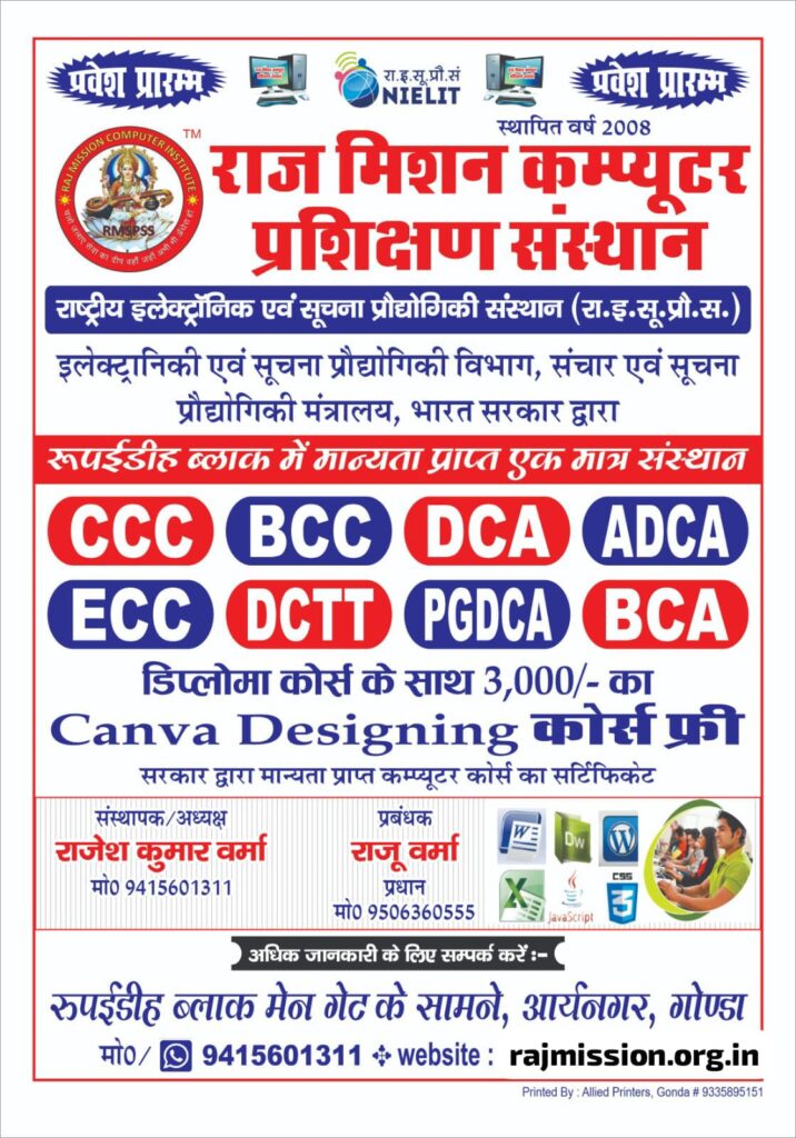 The Raj Mission Computer Concept Course (CCC) is a short-term certification program aimed at enhancing basic computer literacy. It provides foundational knowledge about operating systems, MS Office, internet usage, and digital literacy